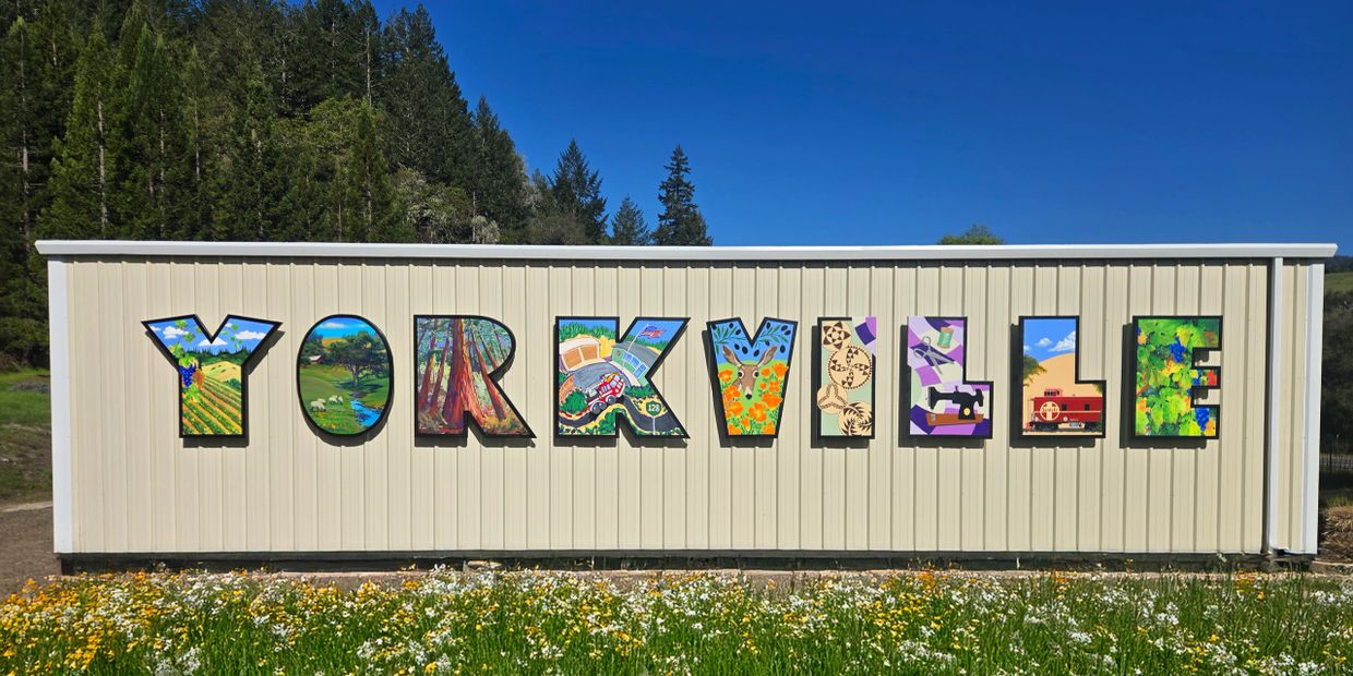 Each letter has a story that links it to YORKVILLE. The Y was created by Tom Rodrigues to depict the rolling hills and vineyards. The O was Sterling Hoffman's vision of the history of agriculture in the valley. The R was a plein aire collaboration of all 5 artists, at the same time, in the Mailliard Redwoods. The K created by Curtis Frost, represents "downtown" Yorkville, the community center/post office and fire station. The V, created by Paula Gray illustrates the natural flora and fauna. The I is the work of Adrian Card, it reflects our native American history with detailed Pomo basketry. The first L is another Paula Gray, portraying the many contributions of the Yorkville Ladies Sewing Circle. The second L is another of Adrian Card's pieces, it highlights the landmark railroad caboose that you see when entering Yorkville from the East. And the E at the end is another of Tom Rodrigues' chronicles of the wine region of Yorkville Highlands.